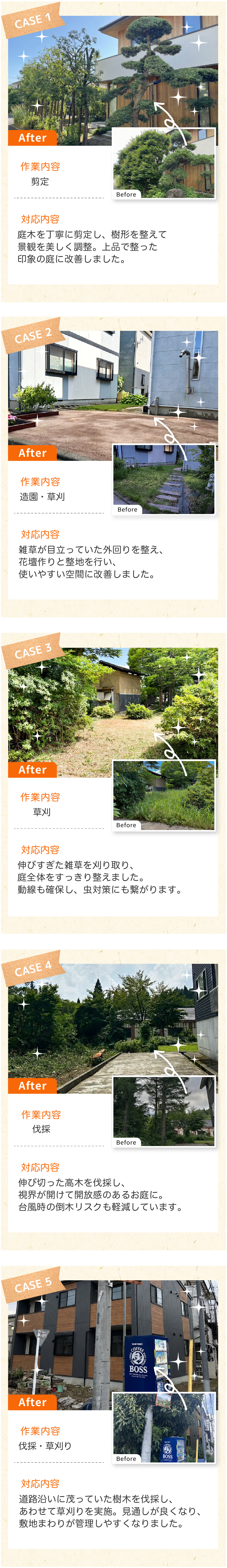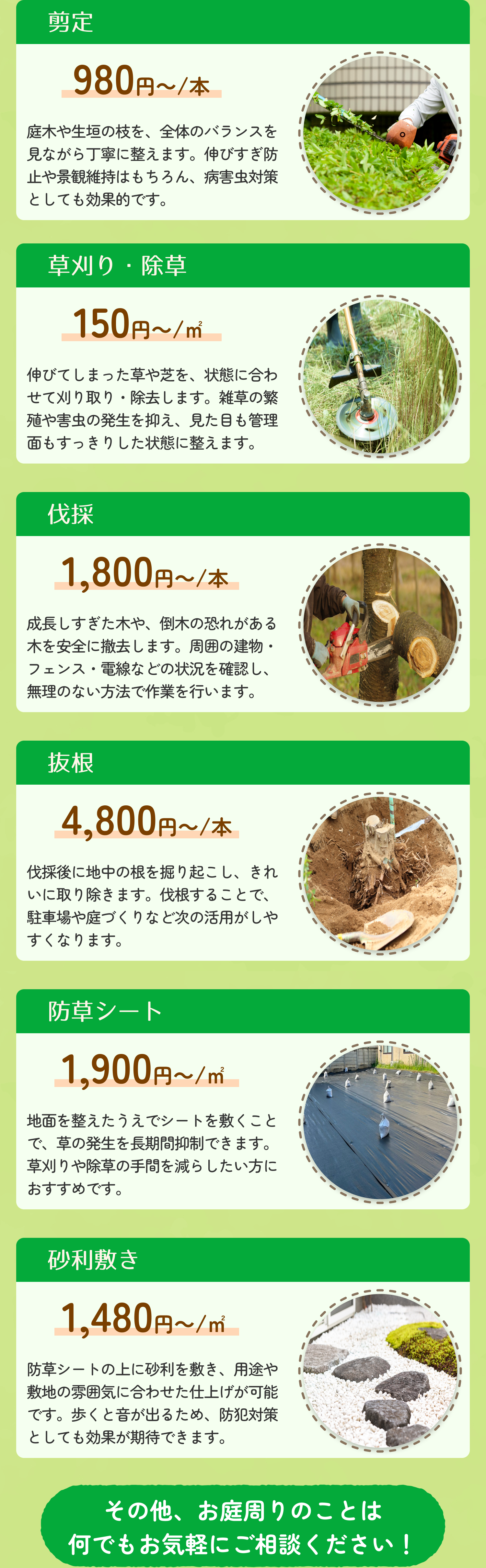 - 事前にご相談をいただければ、予算の範囲内でお庭の手入れをする事が可能です。お庭の一部は自分で手入れをされ、残った高所作業や難しい作業を弊社に依頼するという事も可能ですので、お気軽にお問い合わせください。