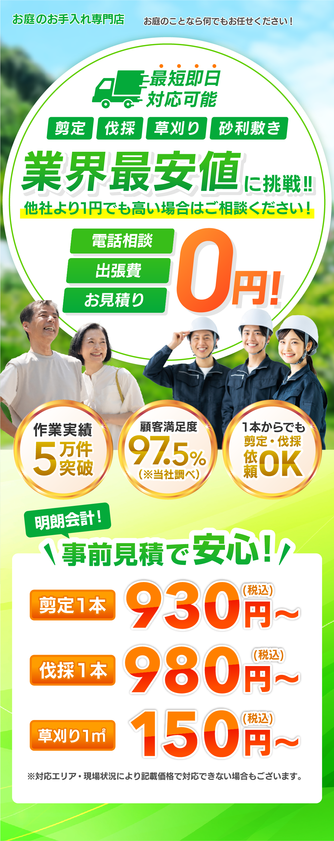 お庭のお手入れ専門店では迅速・丁寧・誠実なサービスを大切にし、お客様一人ひとりのお庭のお悩みに寄り添うことを心がけています。お庭のお手入れは、お庭のお手入れ専門店へお気軽にご相談ください。