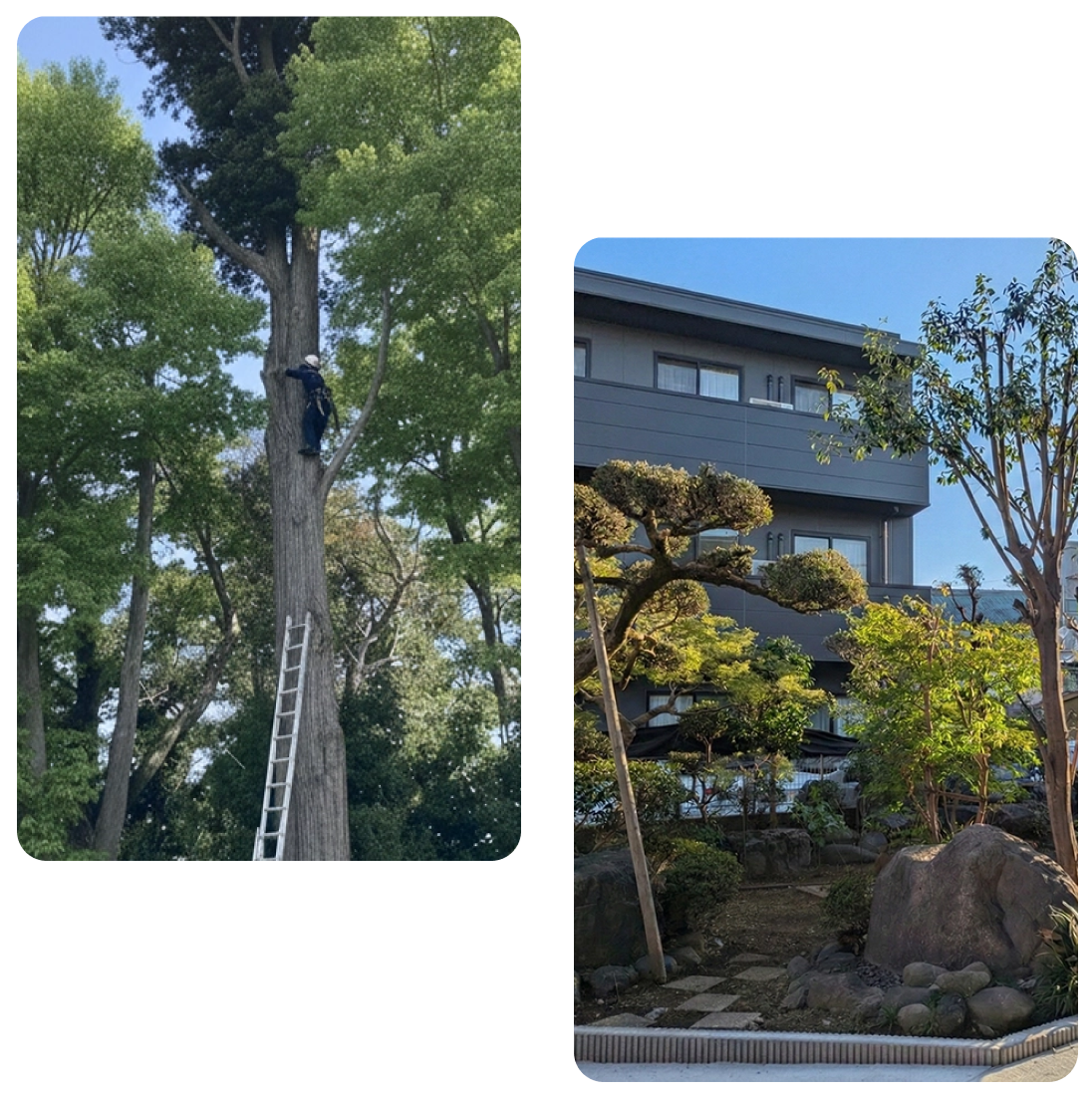 - 事前にご相談をいただければ、予算の範囲内でお庭の手入れをする事が可能です。お庭の一部は自分で手入れをされ、残った高所作業や難しい作業を弊社に依頼するという事も可能ですので、お気軽にお問い合わせください。