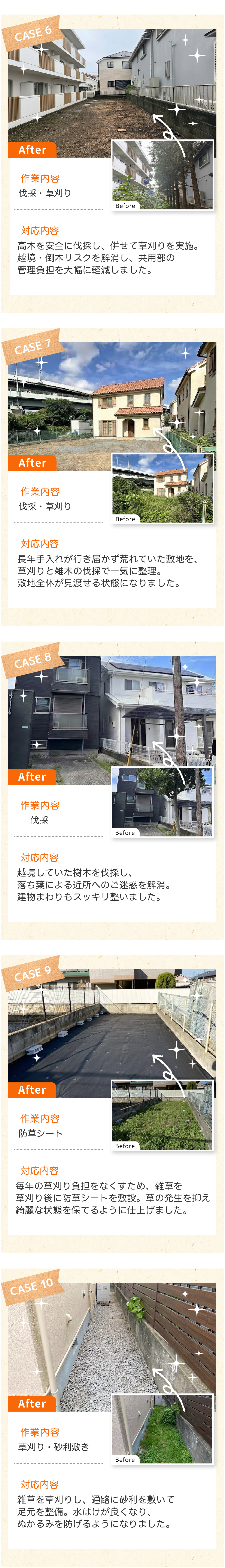 忙しくて放置しがちだったので、定期的な剪定と草刈りをお願いしています。伸び方を見ながら次回の目安も教えてくれるので計画が立てやすいです。毎回片付けまで丁寧で、庭が常に整っている状態を保てています。